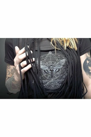 The dark top has an occult moth themed print, front fringes detail, short sleeves, a crew neckline and a comfortable fit.