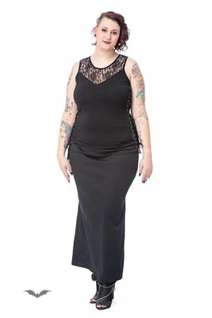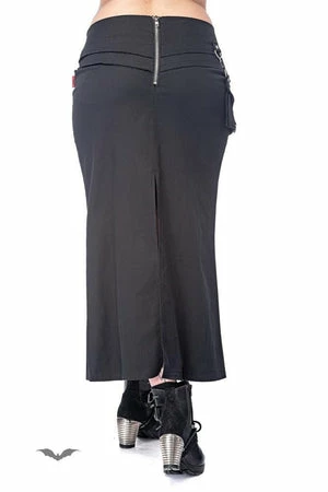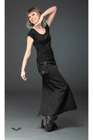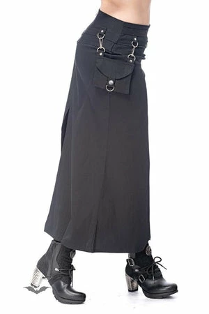 This simple but awesome skirt is designed by Queen of Darkness. This long skirt has two removable pockets fastened by clip on rings. In the middle sits a D ring, perfect for your wallet or chains.