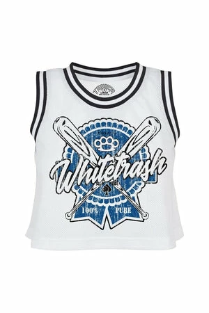 This cropped basketball style vest has Whitetrash Metal print, Toxico x Bad Bones tattoo, a round neckline and a regular fit.