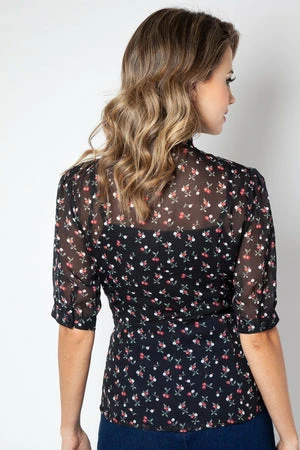 This semi sheer top has an all over cherry print, a U-neckline, short cuffed sleeves, neck tie detailing, a flattering fit and it fastens with buttons at the front.