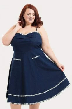 “Daisy May” is a lovely denim flared Rockabilly plus size dress from Voodoo Vixen, with captivating Daisies trim/hem detailing.