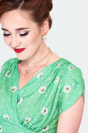 The 60s style midi dress has an all over floral print, pleated bust detail, short sleeves, a V-neckline, a flattering fit and it fastens with a zipper at the back.