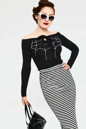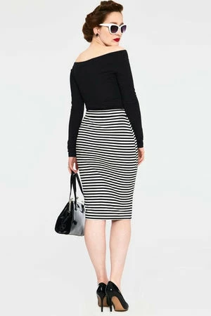 The vintage tube skirt has black and white stripes design and a figure accentuating shape.
