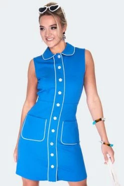 The Retro 60s shift style dress has decorative contrast daisy buttons, edge detail, peter pan collar., collar, a high neckline, pockets with contrast trim, a flattering fit and it fastens with buttons at the front.
