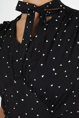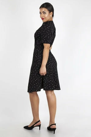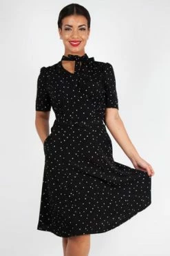 This flared dress has polka dots print, front tie details, short sleeves, a flattering fit and pockets.