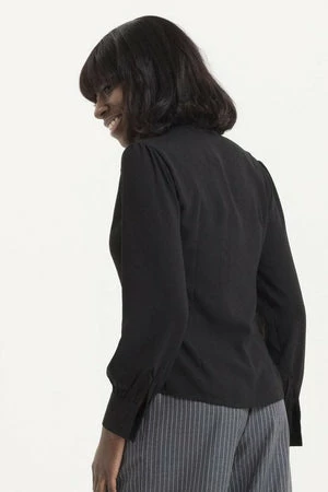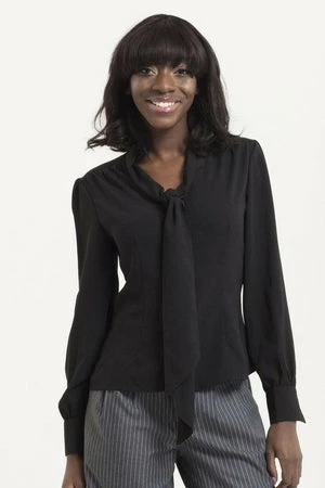 This top has a scooped neckline, neck tie, loose sleeve with fitted cuffs, see-through fabric, bust darts for fit and it fastens at the front with buttons.