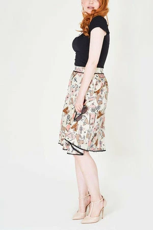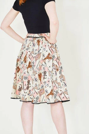 “Marienne” a stunning retro skirt from Voodoo Vixen with a Parisian themed print of Eiffel Towers, poodles and bicycles. This awesome flared rockabilly skirt has decorative black trim at the waist and hem and a hidden zip to fasten at the back.