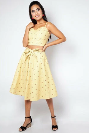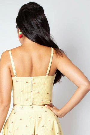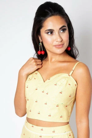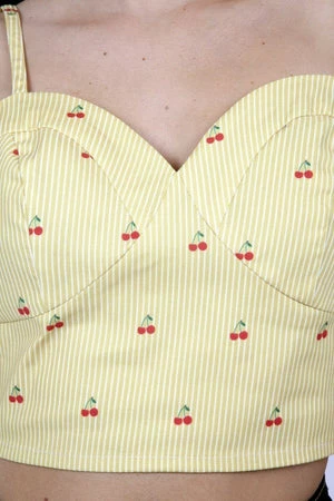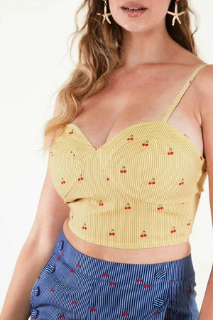 This cropped top has yellow and white stripes, a sweetheart neckline, cherry detailing, spaghetti straps and a flattering fit.