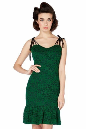 The pencil lace dress has saucy black mesh fabric detailing, decorative edges detailing, two layers and bow detail, a flattering fit and it fastens with a zipper at the back.