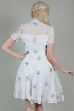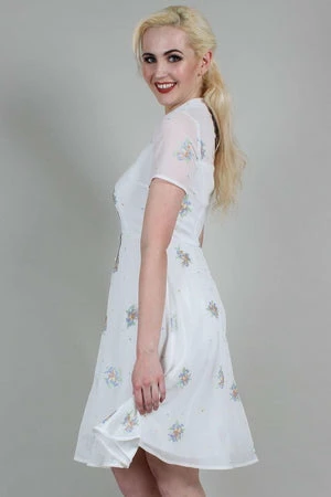 This white chiffon flared dress has vintage cross hatch floral embroidery detail, V-neckline, Peter Pan collar, short sleeves, a flattering fit and it fastens with pearl style buttons at the front.